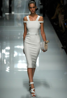 En cuanto a Donatella Versace, su propuesta fue mas de colores enteros y formas geometricas, como los siguientes modelos: